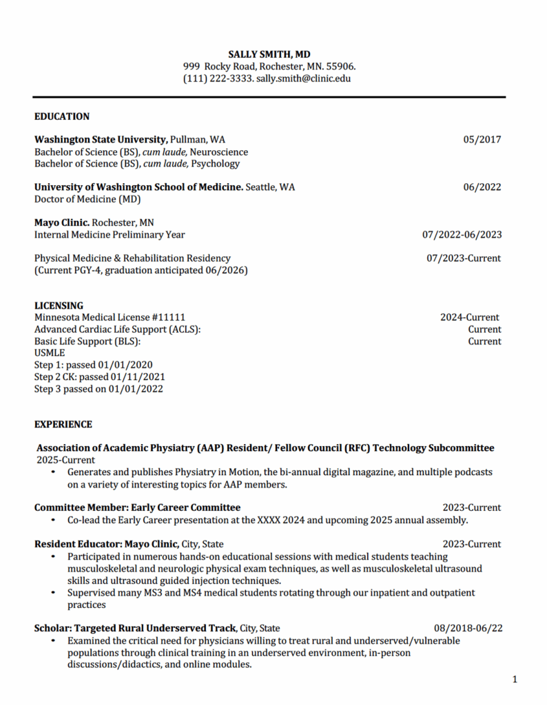 If you aren’t a recent entrant in the field, then you likely have some pm&r employment experience. Don’t be shy about showcasing it! Feel free to add this in the physician CV example above. Hiring entities are searching for different qualities. Some want fresh faces while others want someone with proven experience. Those who are looking for someone with experience will often jump to this portion of the CV before looking at anything else. Make it count.