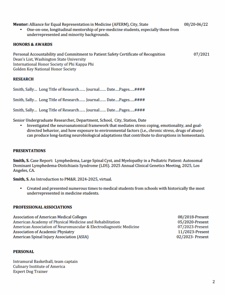 If you’re affiliated with any professional boards or associations, such as the AAPMR, include them on your CV. Many of these associations have strict requirements for admission, and employers know this.